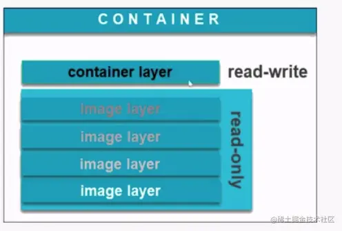 容器container其实是一个运行中的docker image,它其实是复制了image并在image最上层加上了一层read-write。