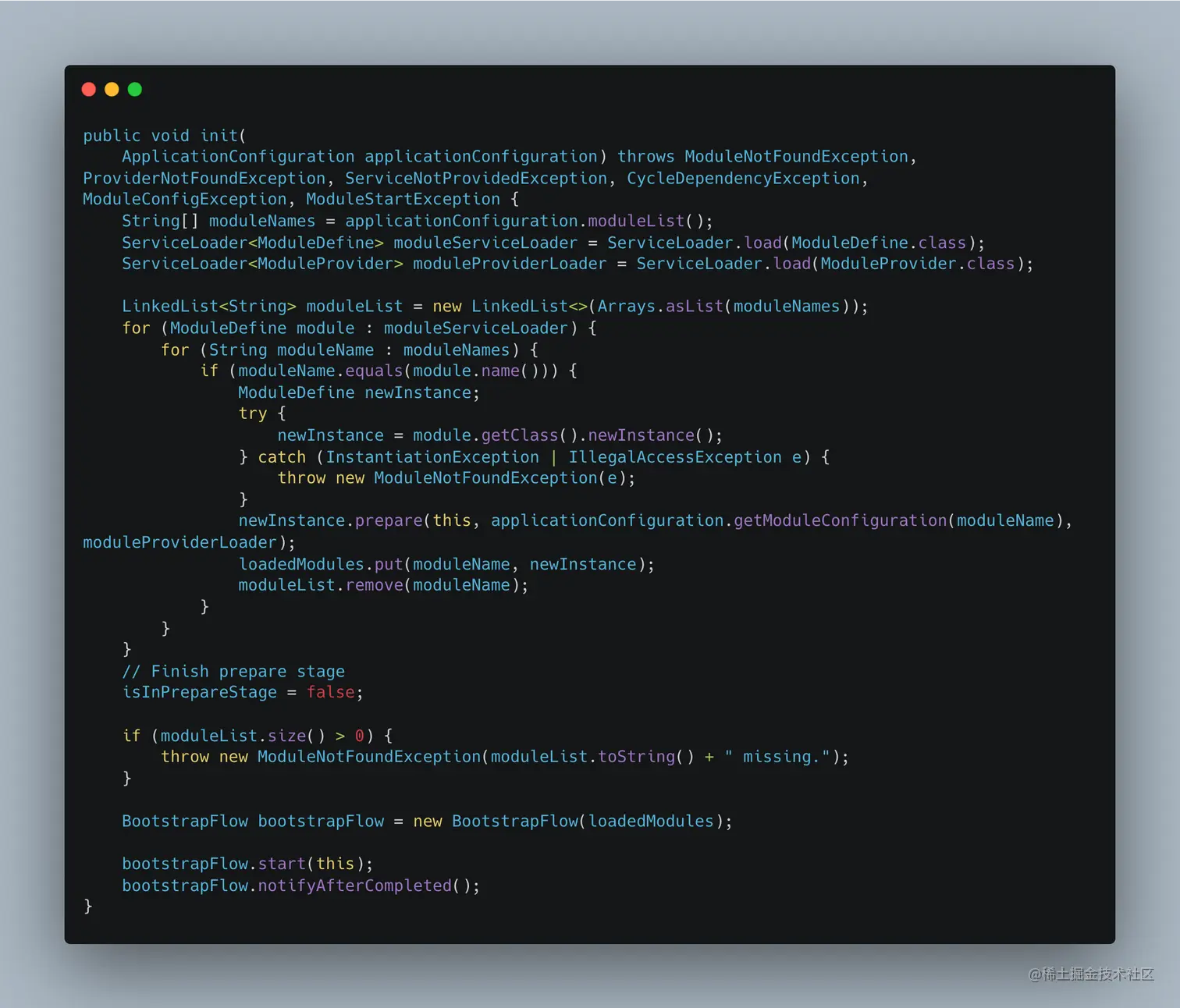 - 创建BootstrapFlow对象,启动ModuleManager对象,完成后调用notifyAfterCompleted()方法通知所有的ModuleProvider实例,表示可以对外提供服务了