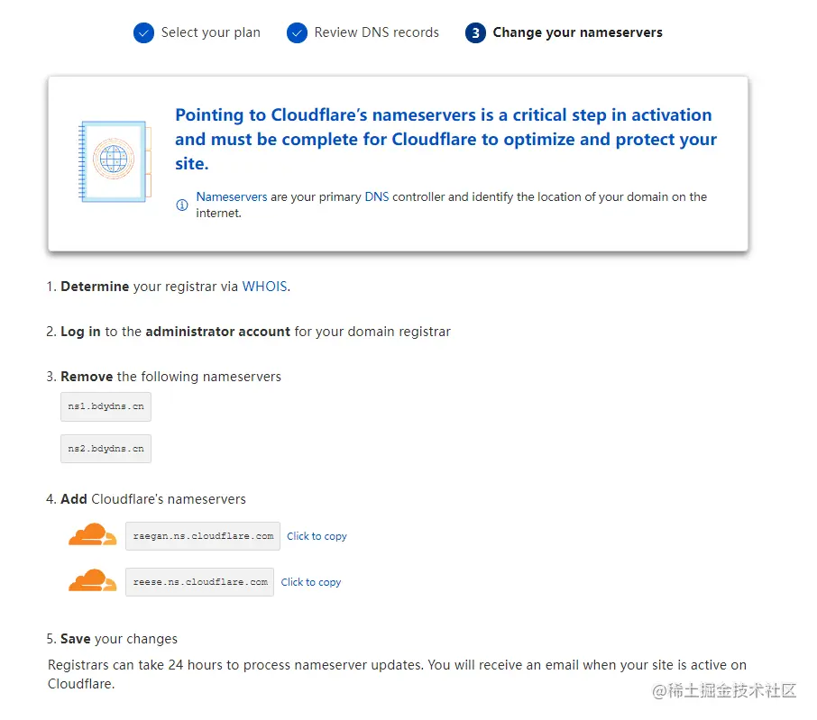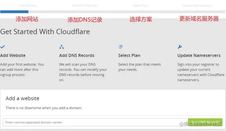 添加网站分为四步:添加网站域名、添加DNS记录、选择方案、更新域名服务器。