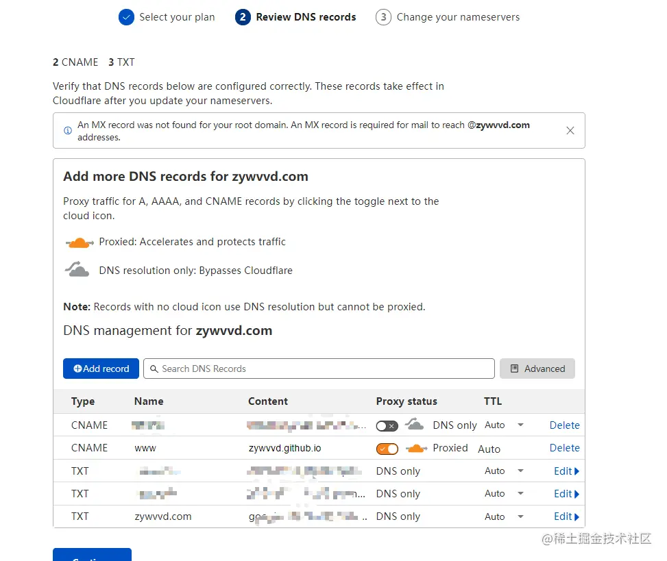 - 下面会列出所有扫描到的 DNS 记录。黄色云朵表示该解析通过 CDN 访问,灰色云朵表示不通过 CDN 访问,点击云朵可以切换状态。这里如果选择不走 CDN 的话,相当于只使用 cloudflare 的 DNS 功能。