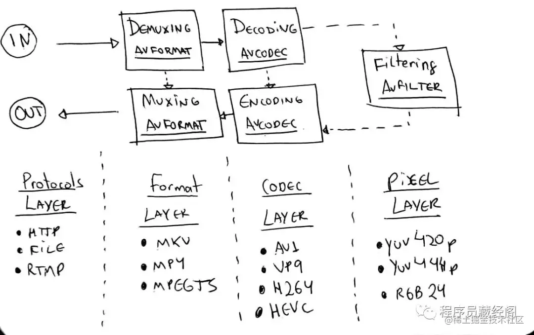 我们仅仅做了重新封装,把一个容器转换为另外一个容器。FFmpeg 也可以做一些编解码的工作,但是我们稍后在讨论它。