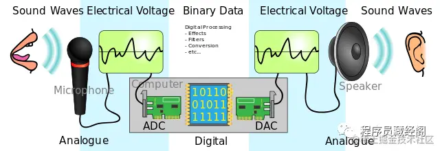 在数字音频系统中,麦克风将声音转换为模拟电信号,然后通常使用脉冲编码调制(PCM)的模数转换器(ADC)将模拟信号转换为数字信号。