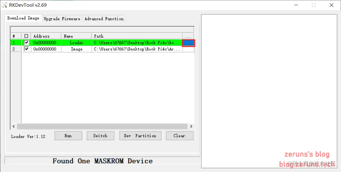接下来,点击右边最后一栏红框中的按钮选择Loader “rk3399_loader_xxxxx.bin”,