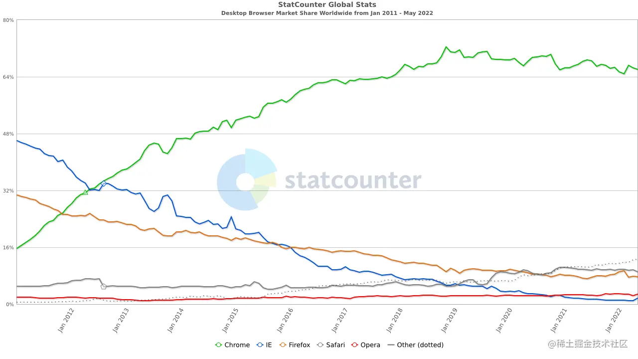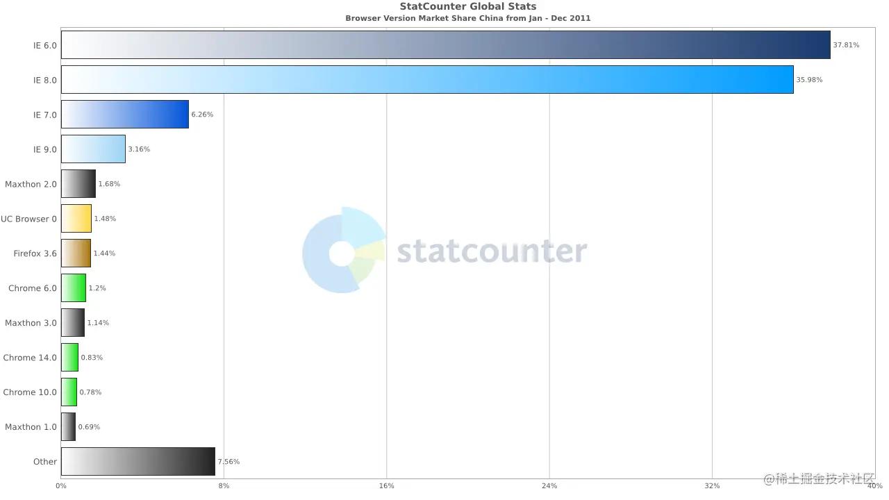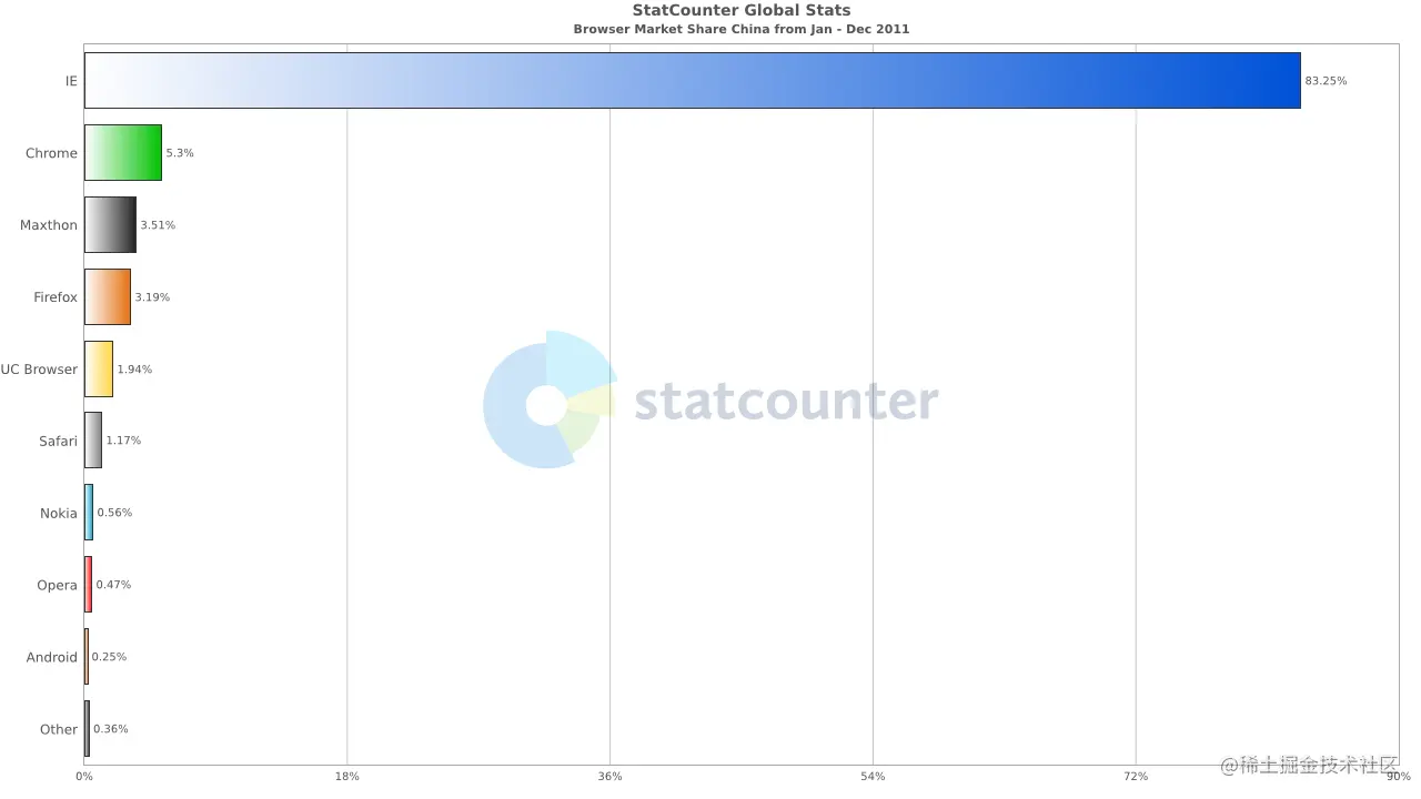 自己在 2011 年刚从业时,IE 在国内的市场占有率可是遥遥领先的,下图来自于 StatCounter 网站的统计结果。