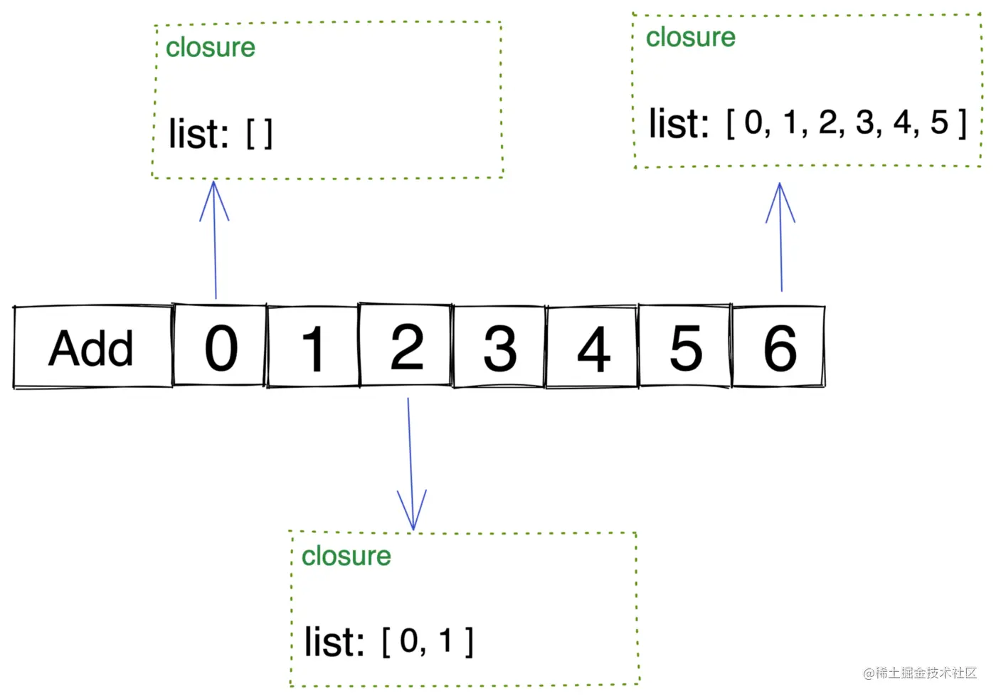 这会导致每个「数字按钮」的 add 函数处于不同的闭包中,每个闭包当中的 list 都不同。