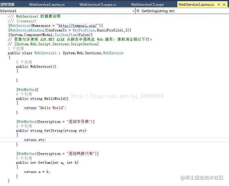 双击打开asmx文件,编写如下代码: