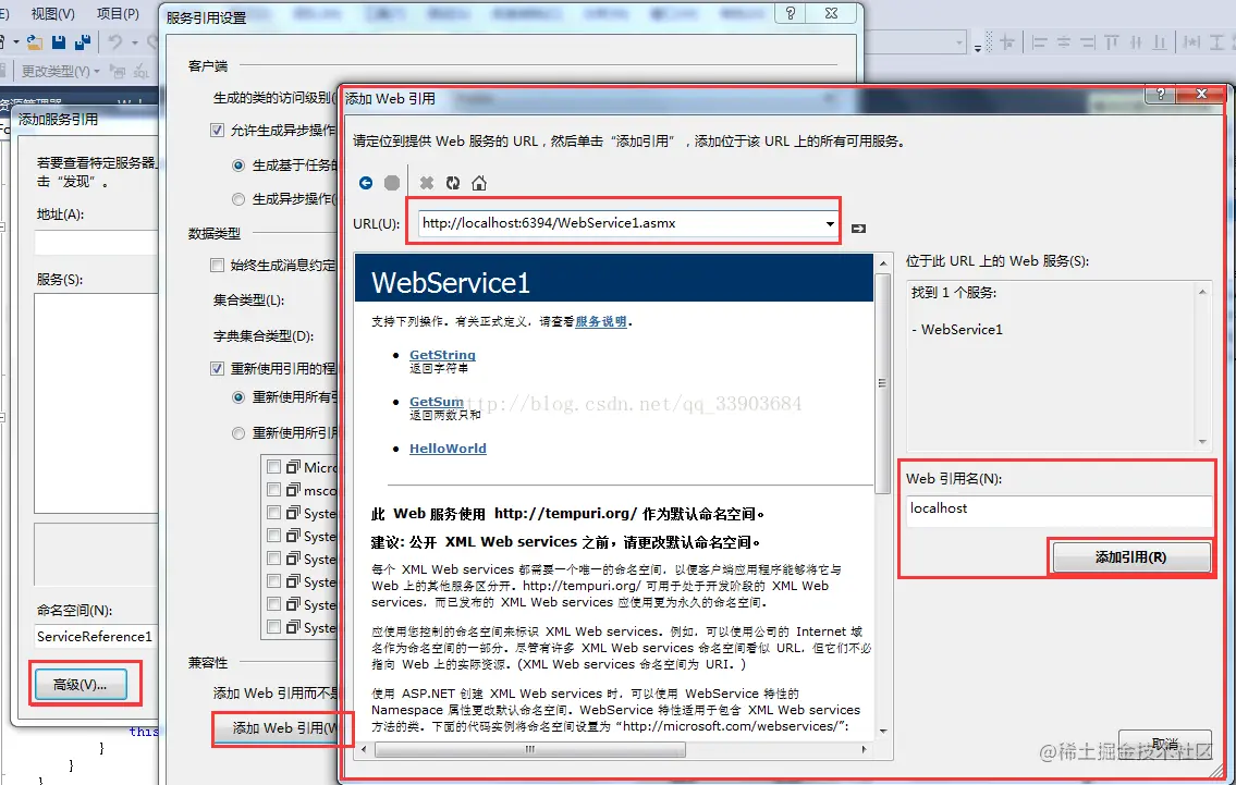 注:WebService1必须运行着,若是关闭了服务(不运行),在调用接口时运行会报错