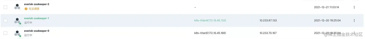 在刚开始接触到K8S的时候,曾经遇到了一个卡住我两天的一个问题,情况就是我要创建一个三节点的zookeeper,但是创建后发现只有两个节点能够正常调度,有一个节点总是无法调度,如下图所示: