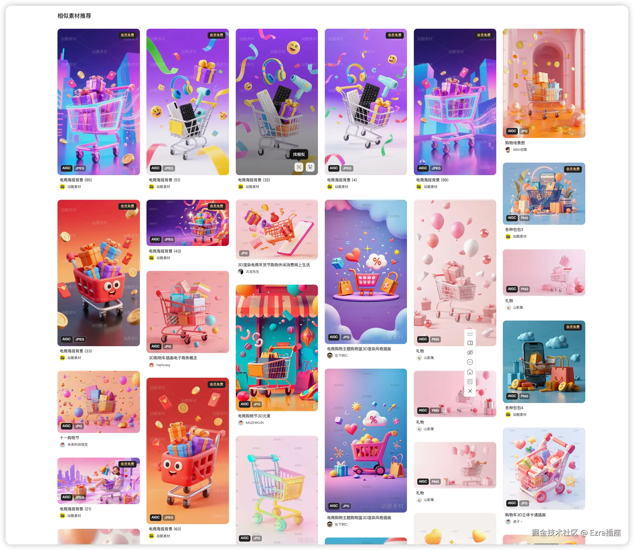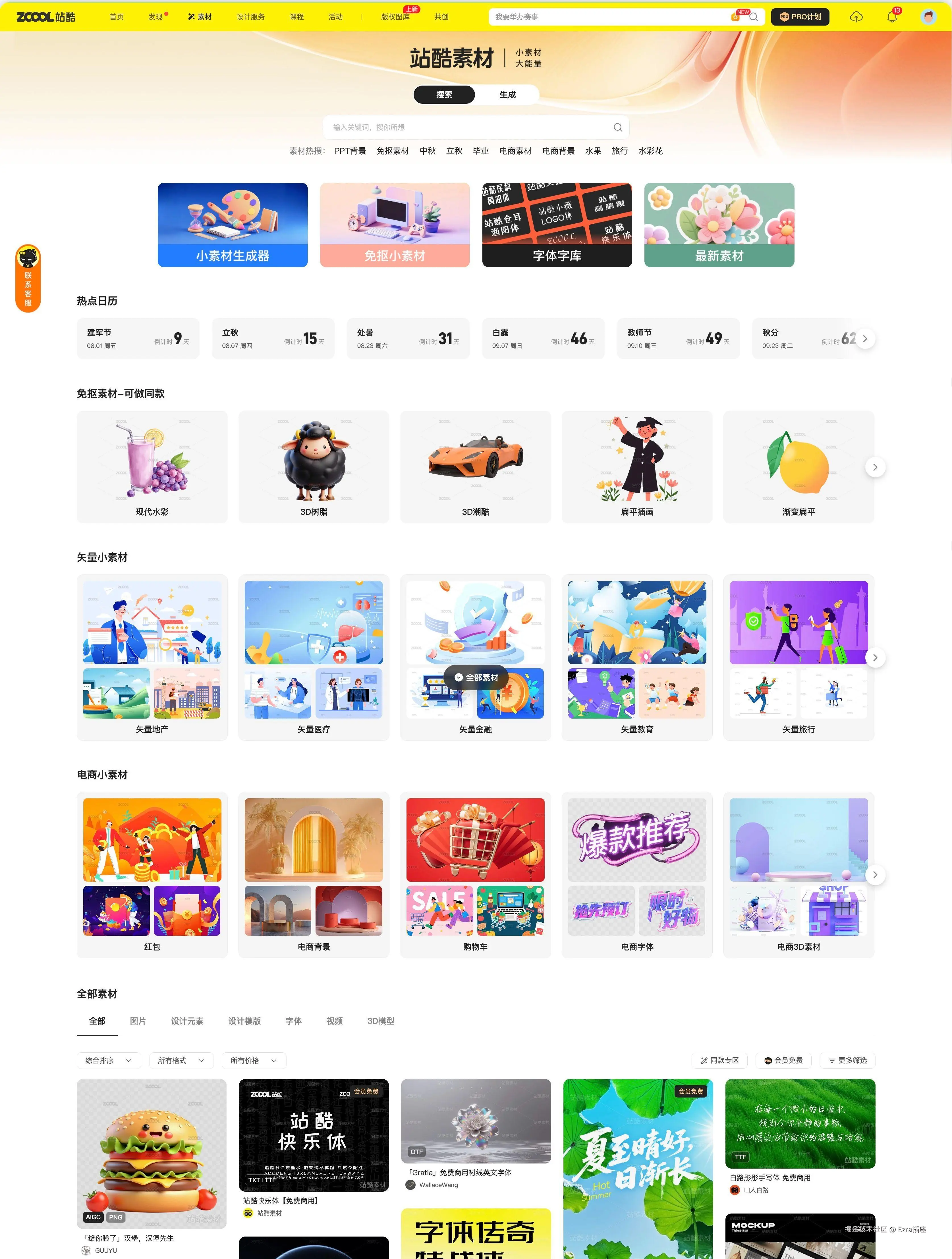 笔者之前做过网站、搞过直播、搭过私域、开过公司,借助第三方工具来帮我快速出图,在使用了一众国内外的产品之后,这就不得不提及国产之光——站酷素材: 站酷素材——专注小素材,量大质优、能搜能生成,不再让创意卡壳
