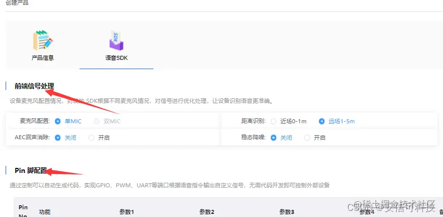 在语音SDK选项中,前端信号处理、Pin脚配置保持默认