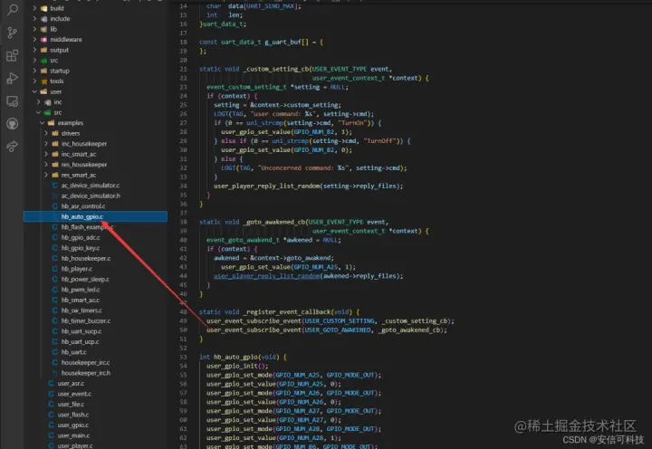 我们需要在这个SDK中添加一个退出唤醒关闭蓝色LED灯的功能,所以需要看一下代码。我们定制的SDK的功能默认是在user/src/examples/hb_auto_gpio.c中,所使用的Demo是USER_DEMO_AUTO_GPIO :