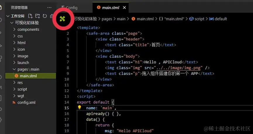 然后找到pages/main/main.stml页面文件,点击左上角的绿色图标,就可以从代码开发切换成可视化开发的界面了。