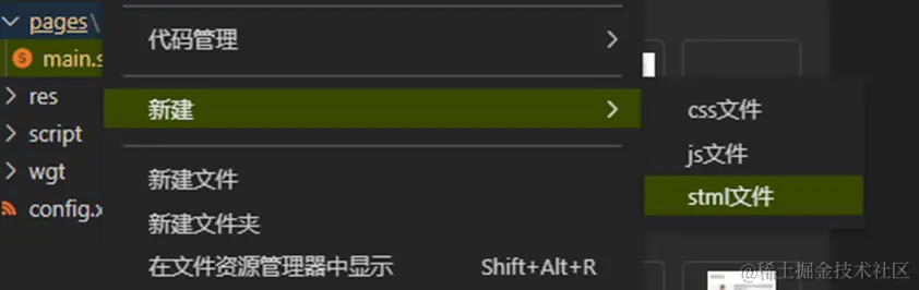 首先在pages中新建一个一个stml文件,因为刚才说到可视化工具是深度捆绑的AVM多端引擎,所以只有扩展名为.stml的文件,才有可视化开发的功能。