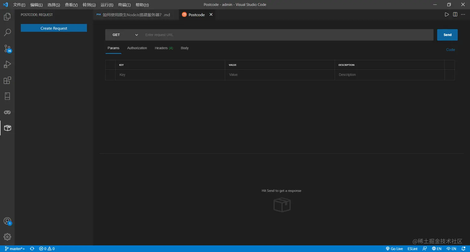 我们再次重启项目,在浏览器中访问localhost:3000便可在vscode终端面板中看到打印的get,说明此次请求是get请求,那么我们如何测试一下post请求呢?我们知道浏览器内没法直接发送post请求,那怎么办呢?我们可以借助一个网络请求调试工具:postman,大家可以自行安装这个工具,在这里我给大家推荐一个更好用的方式,在vscode编辑器中我们安装一个Postcode的插件,我们便可直接在vscode中调试各种类型的请求了,简直不要太方便。通过测试post请求肯定也是没有问题的。