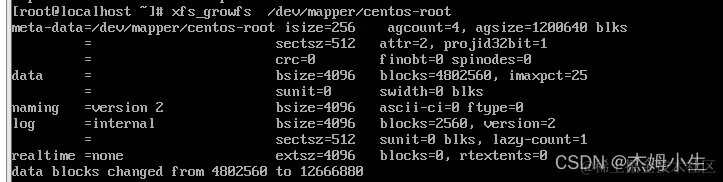 4、 执行命令:xfs_growfs /dev/mapper/centos-root 完成最后一步