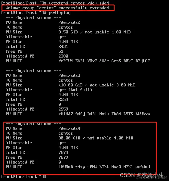 执行命令:vgextend centos /dev/sda4