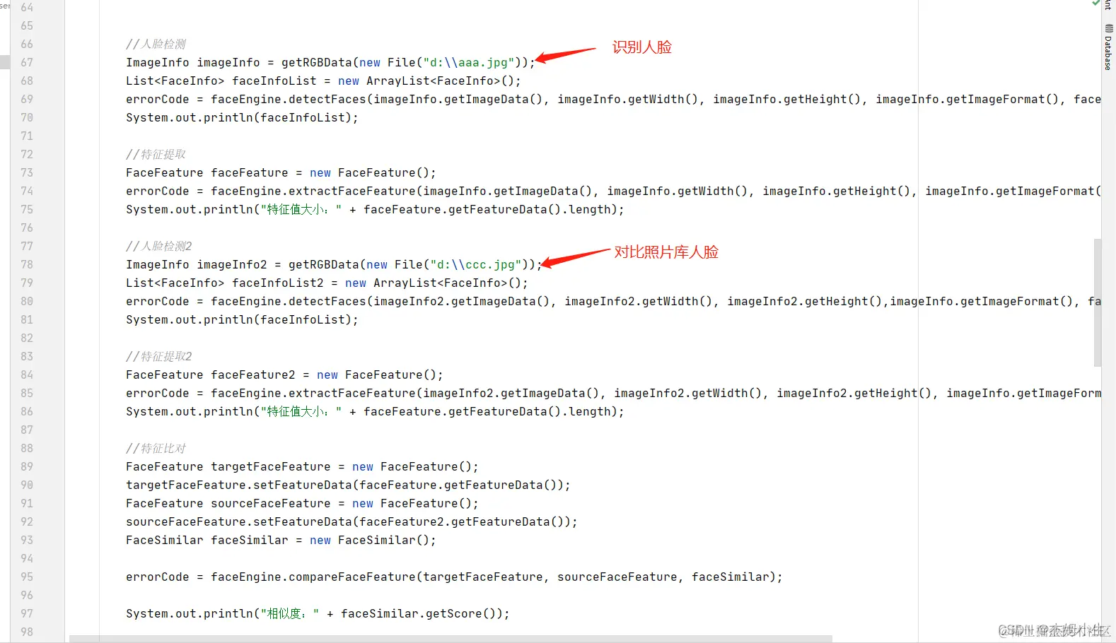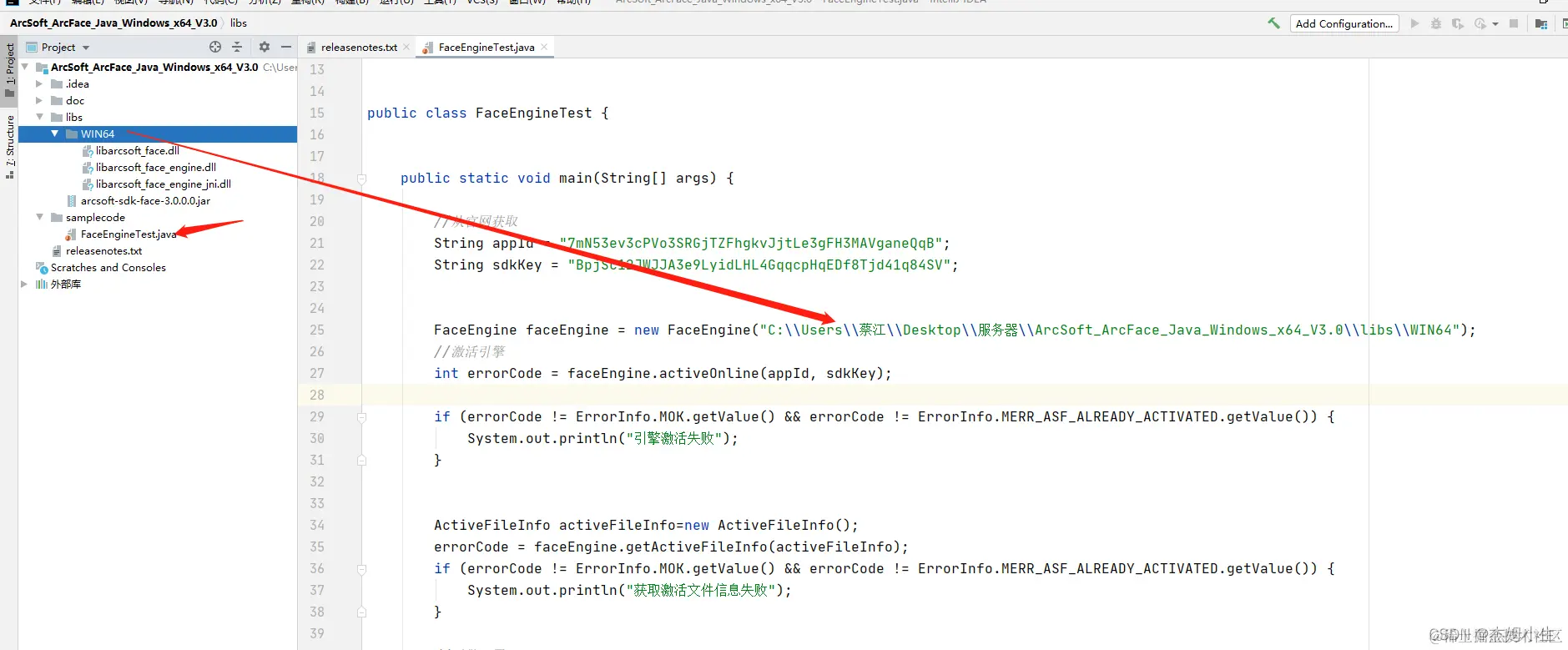 1、使用示例 在 SDK 包里面有一个示例java 把 ArcSkoft文件夹引入进去就可以正常使用了