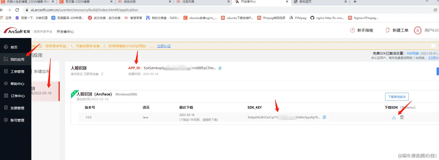 新建应用 根据步骤申请人脸识别应用 下载java SDK包 保存 appId sdkKey数据