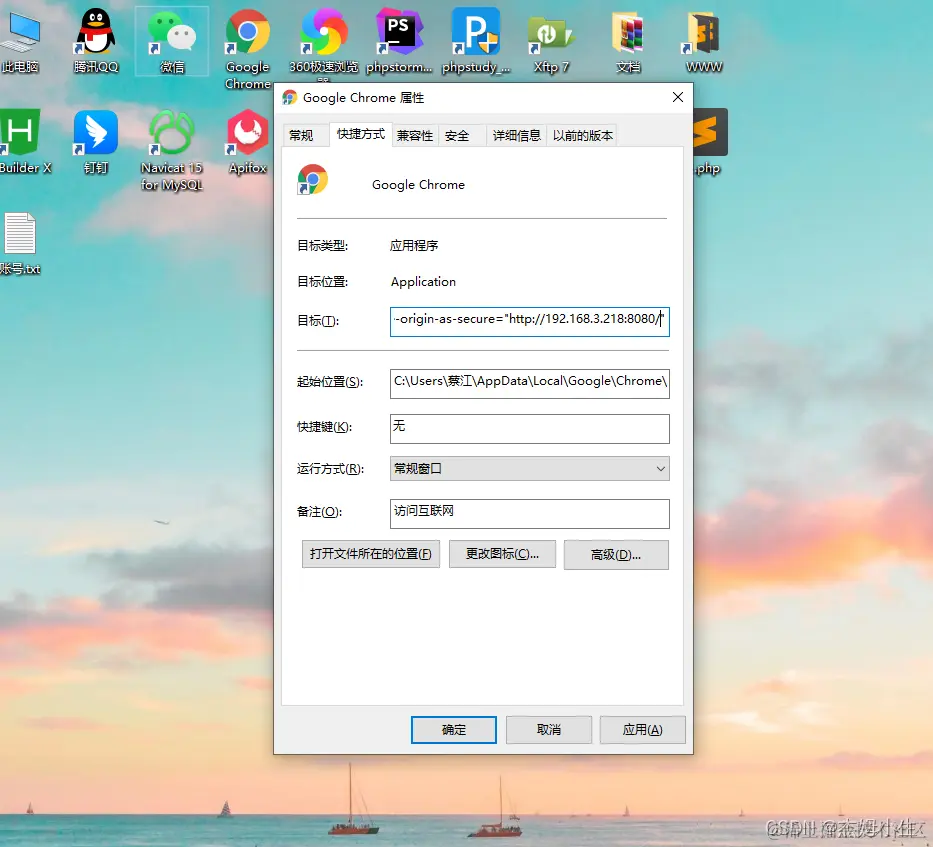 chrome 解决https无法打开摄像头 杰姆小生 2022-06-20 116 阅读1分钟 本文已参与「新人创作礼」活动,一起开启掘金创作之路。 方法一: 地址栏输入chrome://flags/, 搜索 unsafely 编辑 方法二: chrome快捷方式右键->属性->目标 输入框中追加--unsafely-treat-insecure-origin-as-secure="域名地址" 编辑