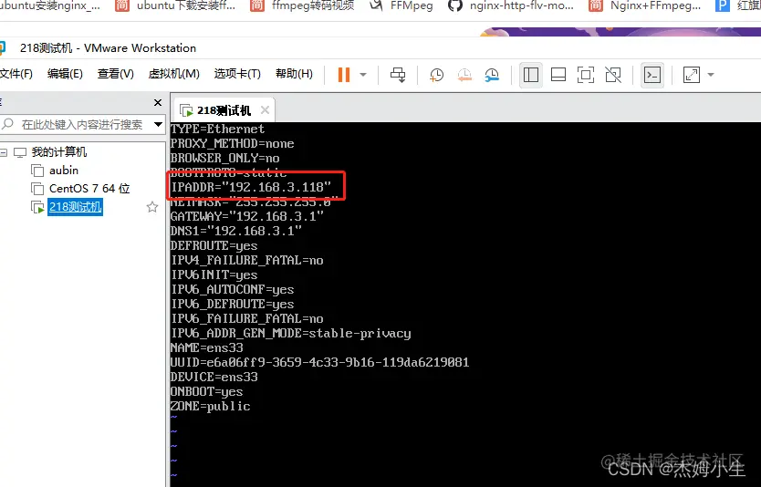 VM虚拟机 Liunx修改ip地址 杰姆小生 2022-06-20 309 阅读1分钟 本文已参与「新人创作礼」活动,一起开启掘金创作之路。 1、一般在百度找到的都是休息 cd /etc/sysconfig/network-scripts/ifcfg-eth0这个文件,这个文件看版本这个文件里面是空的 2、由上面所属我们可以直接找cd /etc/sysconfig/network-scripts/ifcfg-ens33 这个文件修改红色框住的改为自己需要的IP地址就可以 编辑 3、修改IP地址这个地方还是找到重点文件 才行,不让百度那么多 都是深渊坑