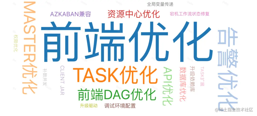 从 Azkaban 完全迁移到 Apache DolphinScheduler 完成大概用时一年,因为涉及到API用户,涉及到 git 用户,还有支持各种各样功能用户,每个项目组都会提出自己的需求,在协助其他团队迁移的整个过程中,根据用户使用反馈,共提交了140+个优化 commit,以下是 commit 分类词云。