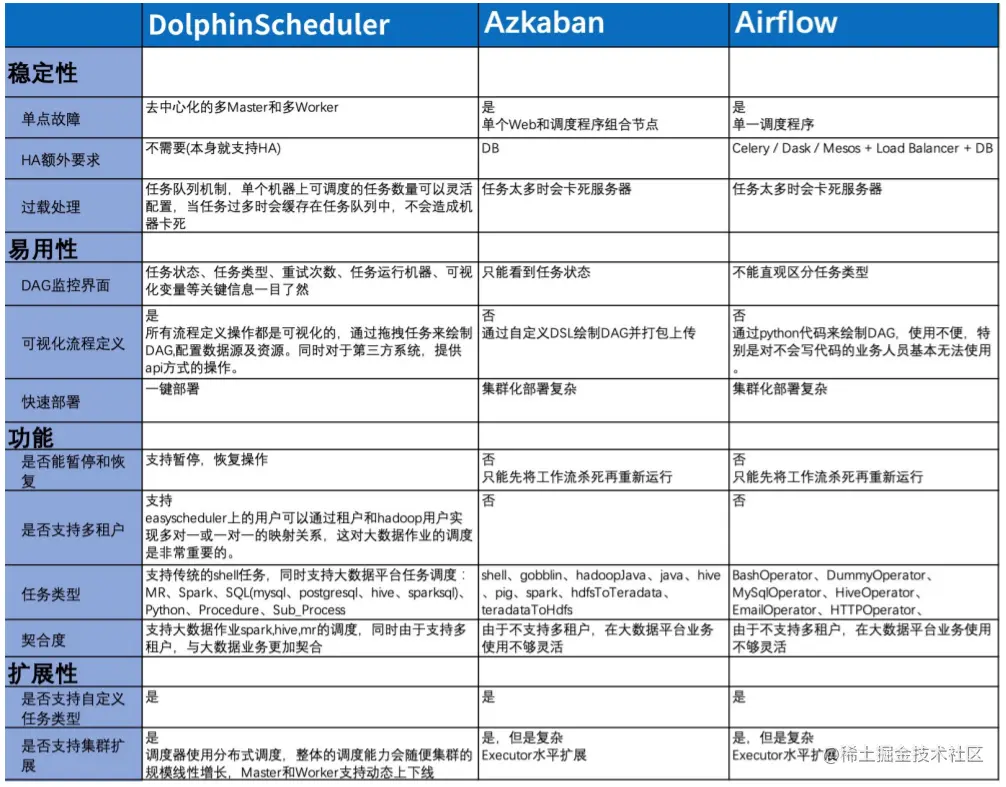 因此,在2019年Apache DolphinScheduler开源时,我们就及时地关注到,并开始了解是否可以进行迁移。当时一同调研了三款软件,Apache Dolphin Scheduler、Azkaban和Airflow。我们基于五大需求。