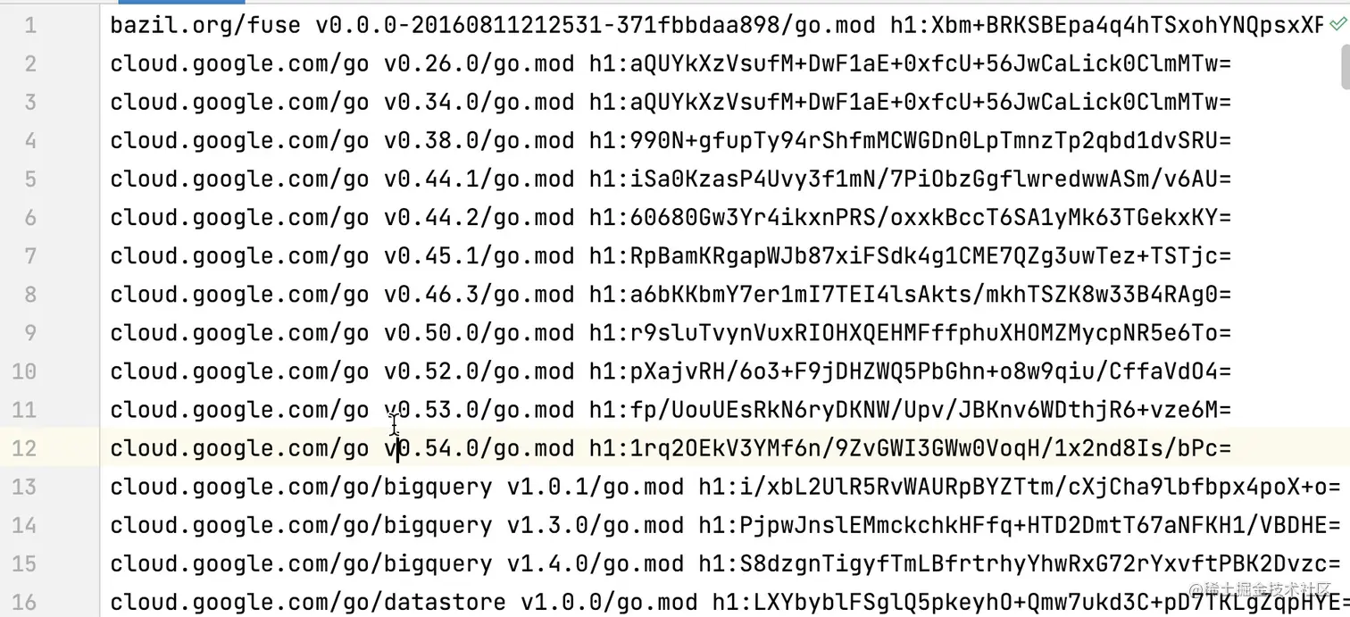 go.sum文件就比较复杂了,密密麻麻的。每一行都是由模块路径,模块版本,哈希值组成,其中哈希值是用来保证当前缓存的模块不会被篡改。hash是以h1:开头的字符串,表示生成checksum的算法是第一版的hash算法。