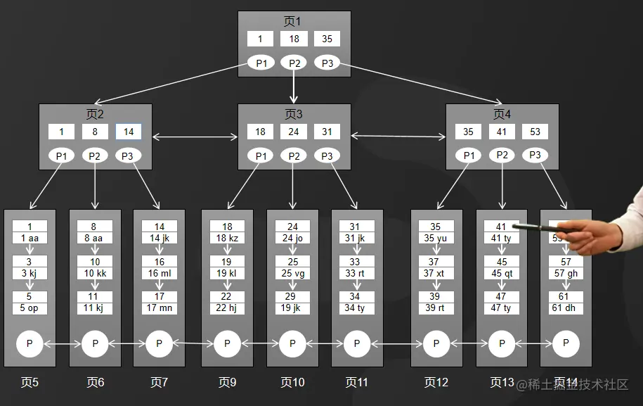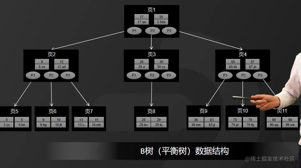 一般来说,数据库的存储引擎都是采用B树或者B+树来实现索引的存储。首先来看B树,如图所示。