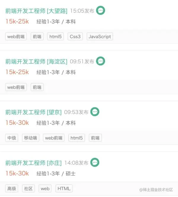 第一张图为在某主流互联网行业招聘网站上,搜索“前端”限定“3年及以内”经验后最先出现的4份岗位待遇信息。下文中后端、全栈薪资信息截图条件相同。