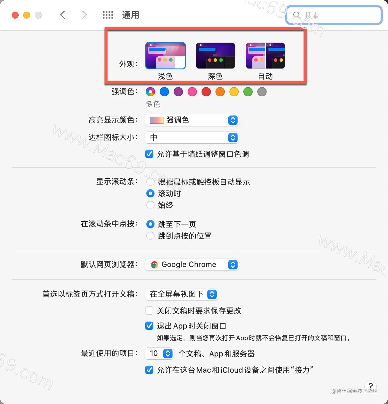 设置Mac电脑顶部菜单栏颜色? Windows阿咪 2022-06-20 3,448 阅读1分钟 在Mac电脑中如何给屏幕顶部的菜单栏设置一个漂亮的颜色?这个操作特别简单。下面我们分享设置mac电脑顶部菜单栏颜色的操作步骤。一起来看看吧! 1、打开Mac电脑中的系统偏好设置; 2、进入偏好设置,点击“通用”; 3、就可以看到外观后面的颜色选择图 4、点击自己喜欢的颜色,或选择自动,就好啦~ 还有哪些关于macOS的操作技巧,欢迎来交流。