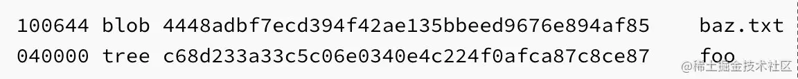 树本身会包含它当中内容的指针,baz.txt(blobl)和foo(tree)。如果我们查看baz.txt这个hash值中对应的内容,命令git cat-file -p 4448adbf7ecd394f42ae135bbeed9676e894af85,我们可以看到如下结果: