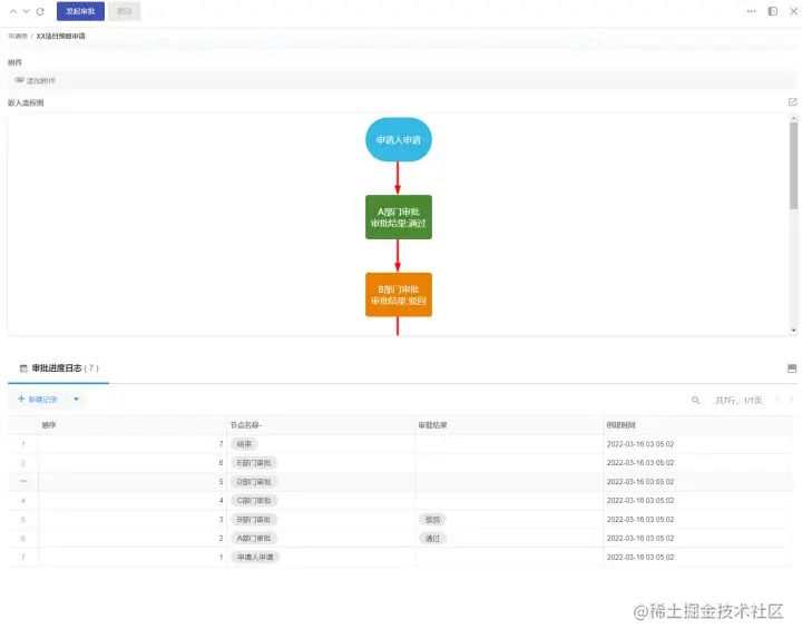 简单举一个运用API能力的例子:通过外部程序调用接口,实现个性化的审批流程图。在审批工作表里结合嵌入控件的话,就可以让审批记录和流程图在同一界面实时呈现。