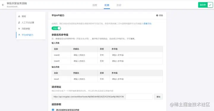 针对一些需要外部对接的流程,可以在封装业务流程的“配置”板块里一键生成可调用的接口。不涉及对接的流程可以跳过该步骤。