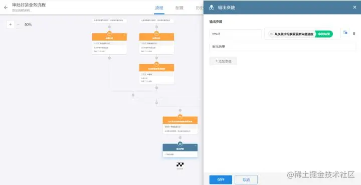 定义输出参数,审批完成后,就可以将最新的审批进度(result)回传给主流程,用于分支判定。执行完毕后输出节点,封装业务流程就结束了。