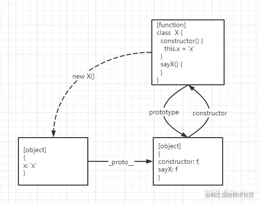 console.log(xobj.__proto__ == X.prototype); // 输出为true, 即xobj的原型链__proto__指向函数的原型对象prototype,
