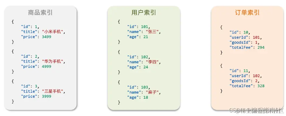 elasticsearch是面向文档(Document) 存储的,可以是数据库中的一条商品数据,一个订单信息。文档数据会被序列化为json格式后存储在elasticsearch中: