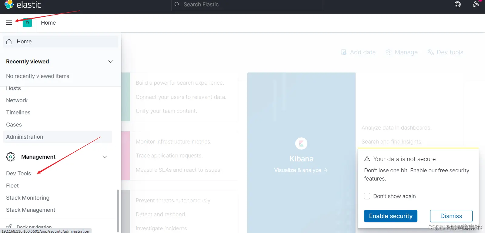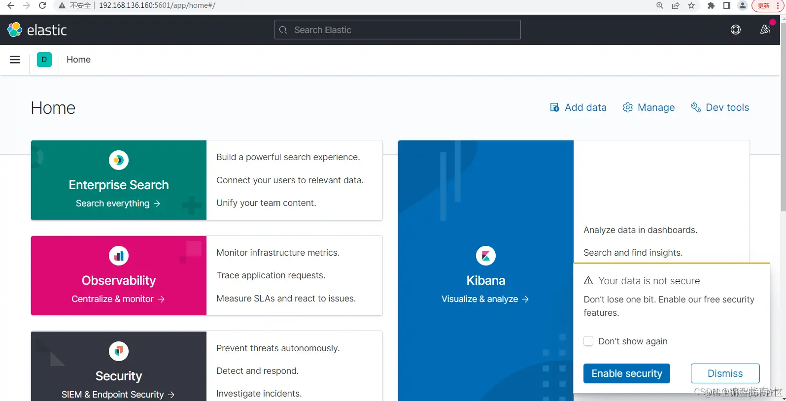 访问http://192.168.136.160:5601访问,可以看到kibana运行的主页