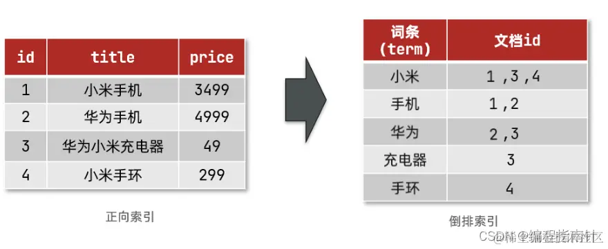 - 而倒排索引则相反,是先找到用户要搜索的词条,根据词条得到保护词条的文档的id,然后根据id获取文档。是根据词条找文档的过程。
