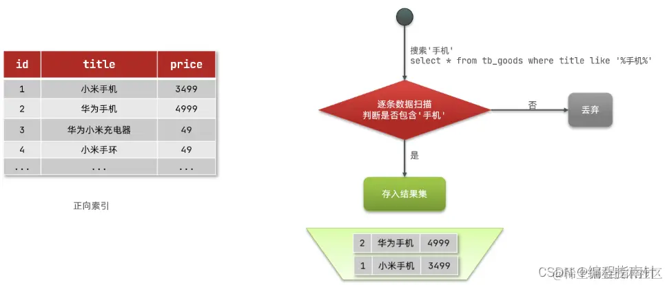 但如果是基于title做模糊查询,只能是逐行扫描数据,流程如下: