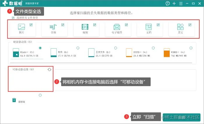 步骤1.进入软件后选择自己丢失的文件类型以及丢失路径(相机的数据存储在内置的内存卡,需要取出内存卡并通过读卡器连接电脑后选择可移动设备),随后“扫描”;