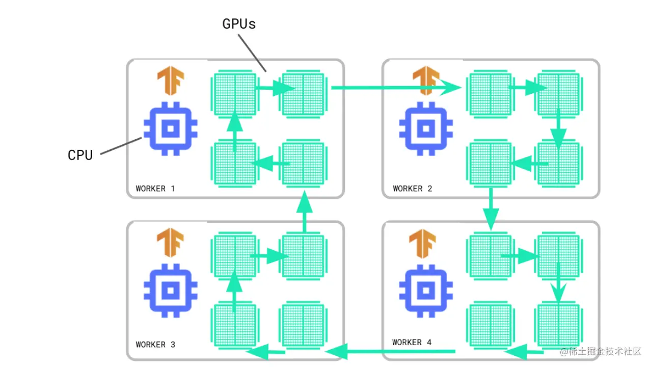 [MultiWorkerMirroredStrategy](https://www.tensorflow.org/api_docs/python/tf/distribute/MultiWorkerMirroredStrategy)已经脱离了实验阶段,现在是稳定 API 的一部分。就像它的单工作者对应物一样。 [MirroredStrategy](https://www.tensorflow.org/api_docs/python/tf/distribute/MirroredStrategy)一样,MultiWorkerMirroredStrategy ,通过同步数据并行实现分布式训练。然而,正如其名称所示,通过MultiWorkerMirroredStrategy ,你可以在多台机器上进行训练,每台机器可能有多个GPU。