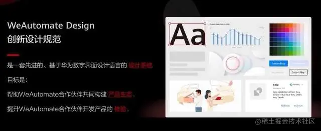 WeAutomate Design相当于产业伙伴的武器库,通过这套设计规范,不同组织的数字机器人能够适配业务场景的差异,保障产品的一致性。还可以通过内置的通用性组件和模版提升产品开发效率,确保产品风格一致、提升生态产品的品牌。