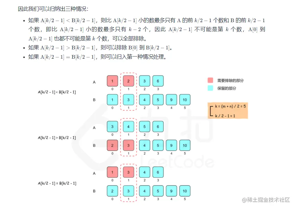 - 取 pivot = min(pivot1, pivot2),两个数组中小于等于 pivot 的元素共计不会超过 (k/2-1) + (k/2-1) <= k-2 个