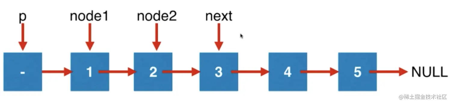 - 定义指针node2,初始值是 p.next.next,也就是node1.next