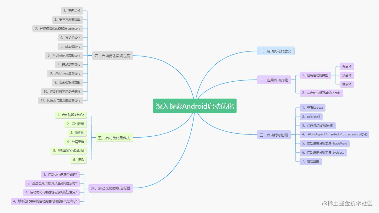 你可能会一下子想到很多方面的细节点,比如:要优化主线程耗时、要减少布局层级、要对某些启动任务做按需加载或预加载、要避免主线程I0、要对线程使用进行优化、还要有分析工具帮助定位性能问题等.......