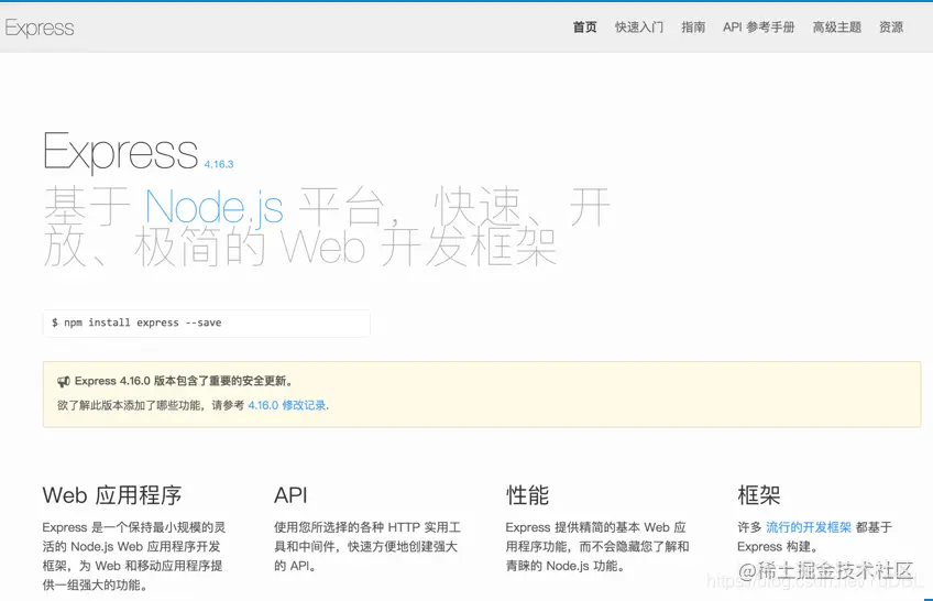打开英文官网有时候很费劲,当然我们也可以来看看express的中文网:Express - 基于 Node.js 平台的 web 应用开发框架 - Express 中文文档 | Express 中文网,首先我们可以来看“首页”,可以看到它对express的一些简单介绍,如下: