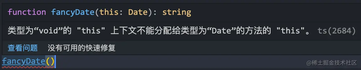 由于 this 调用方式的特殊性,在 ts 中我们有“保底”方案,对于函数来说,如果你定义的函数中使用了 this, 可以在函数的第一个参数中声明 this 的类型,这样每次调用函数的时候, ts 确保 this 的类型一定是你预期声明的类型,看代码: