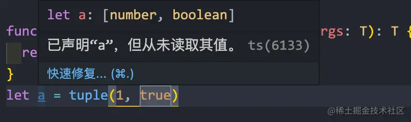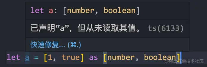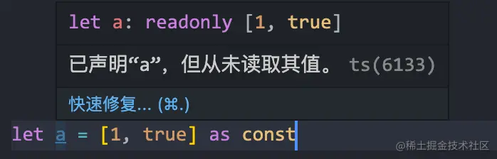这种 as const 的方式有副作用,会把类型置为 readonly 并且类型变为const类型, 即 a 的实际类型为: readonly [1, true]
