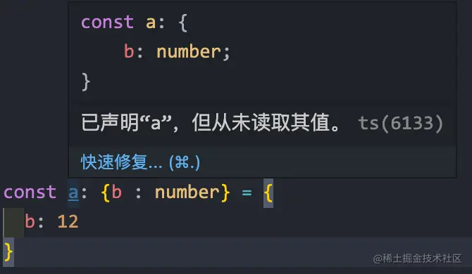 这里很奇怪的是 ts 推导出来的 b 居然是一个 number 类型,而不是字面量12。上面第一个例子来说 const 或者 let 声明 是对ts推导有影响的,这些都是作用于基本类型,使用 const 声明对象的话,ts的推导就不会缩窄,这条规则也就失效了。这种情况类似 esnext 中的 const 声明。