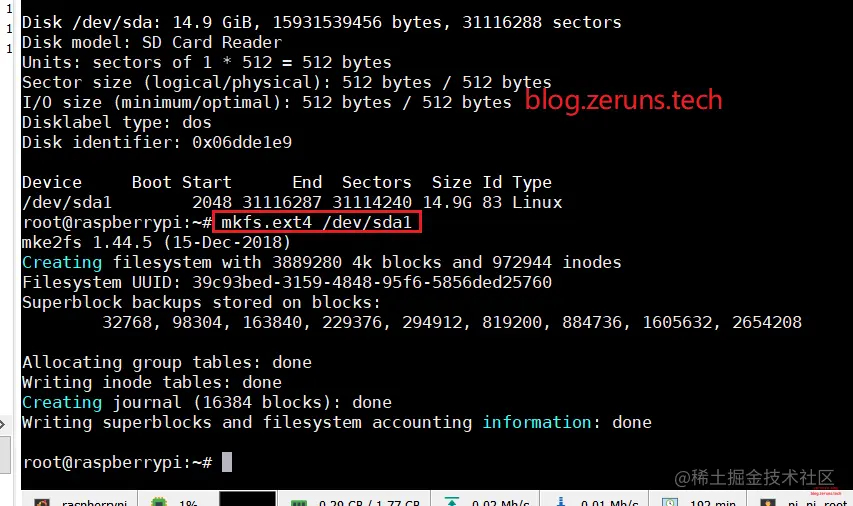 命令中的ext4是文件系统格式,这里可以用ext3,也可以用ext4。